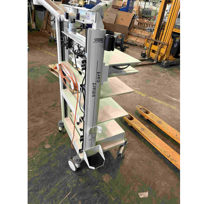 Gerätewagen mit schwenkbarem Monitorarm, Trenntrafo, vielen Ablagen und Schubladen, sg.Zst. trolley, cart for medical devices, with moveable monitor arm, many shelfes, drawer, vg.cond.