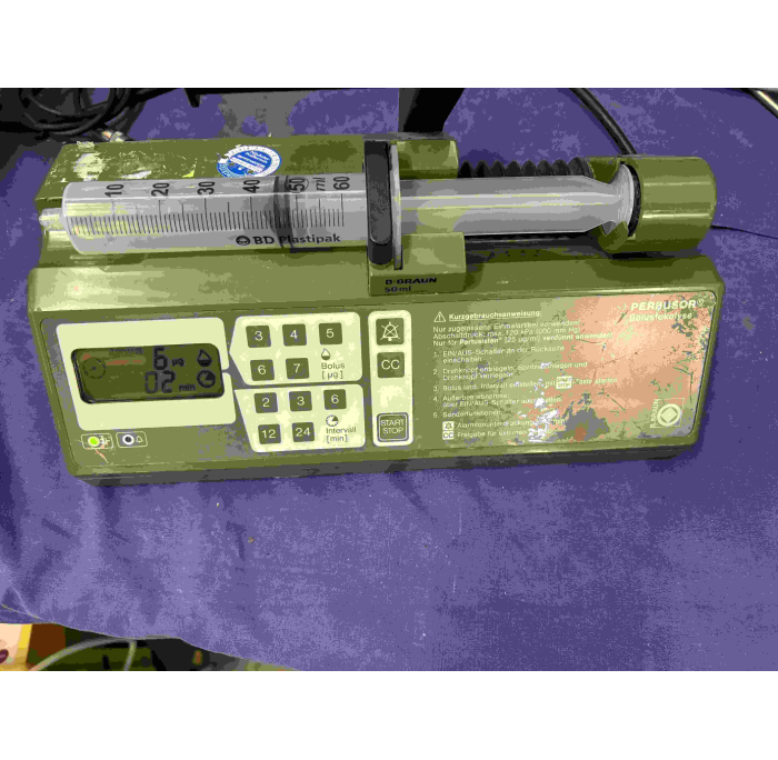 gebraucht, sehr guter Zustand, mit externem bzw. internem Netzteil, Akku - - perfusor, syringe pump, rate of delivery 0.1 to 99.9ml/h, rechargeable battery, very good condition with power supply
