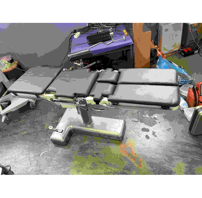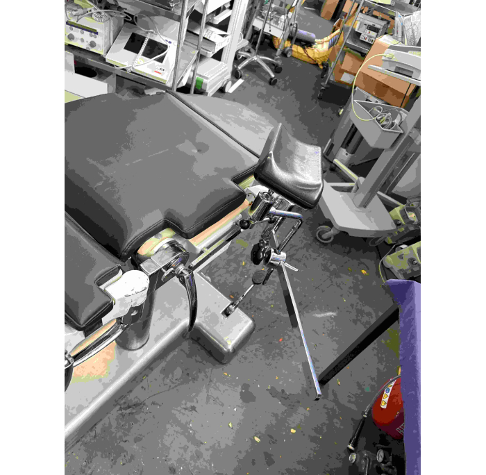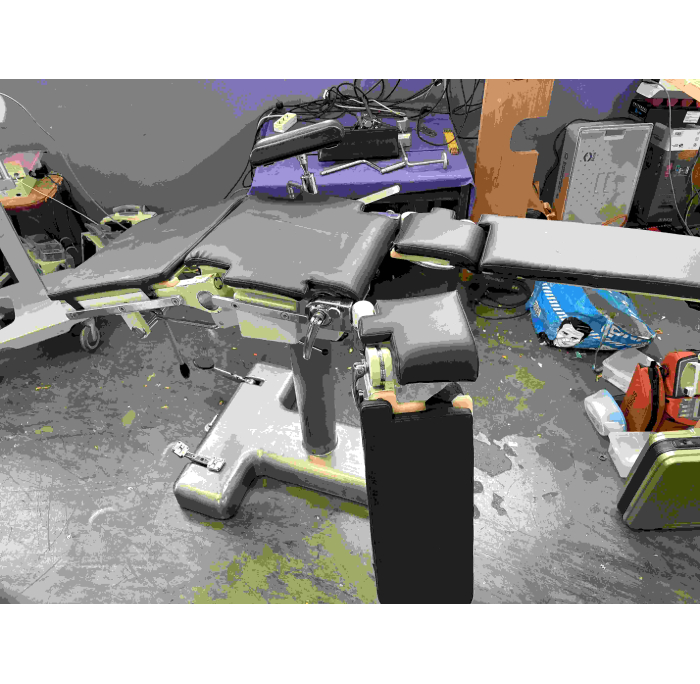 hydraulischer OP Tisch mit Kopfplatte, geteilter Beinplatte, höhenverstellbar, neigbar, neuwertige Polsterung, mit einer Armauflage, sg. Zst.---Hydraulic operating table with headrest, split legrest, height adjustable, tiltable, new upholstery, with one arm rest, vg. condition.