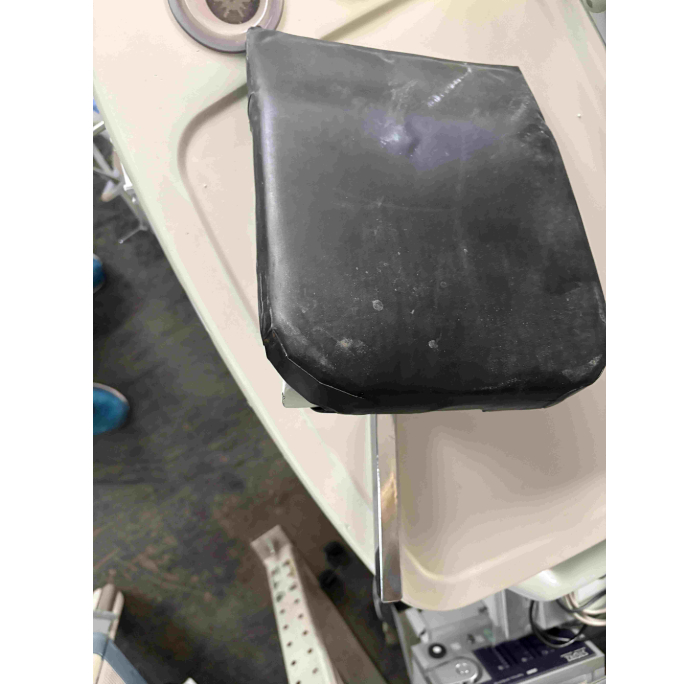 hydraulischer OP Tisch mit Kopfplatte, geteilter Beinplatte, höhenverstellbar, neigbar, neuwertige Polsterung, mit einer Armauflage, sg. Zst.